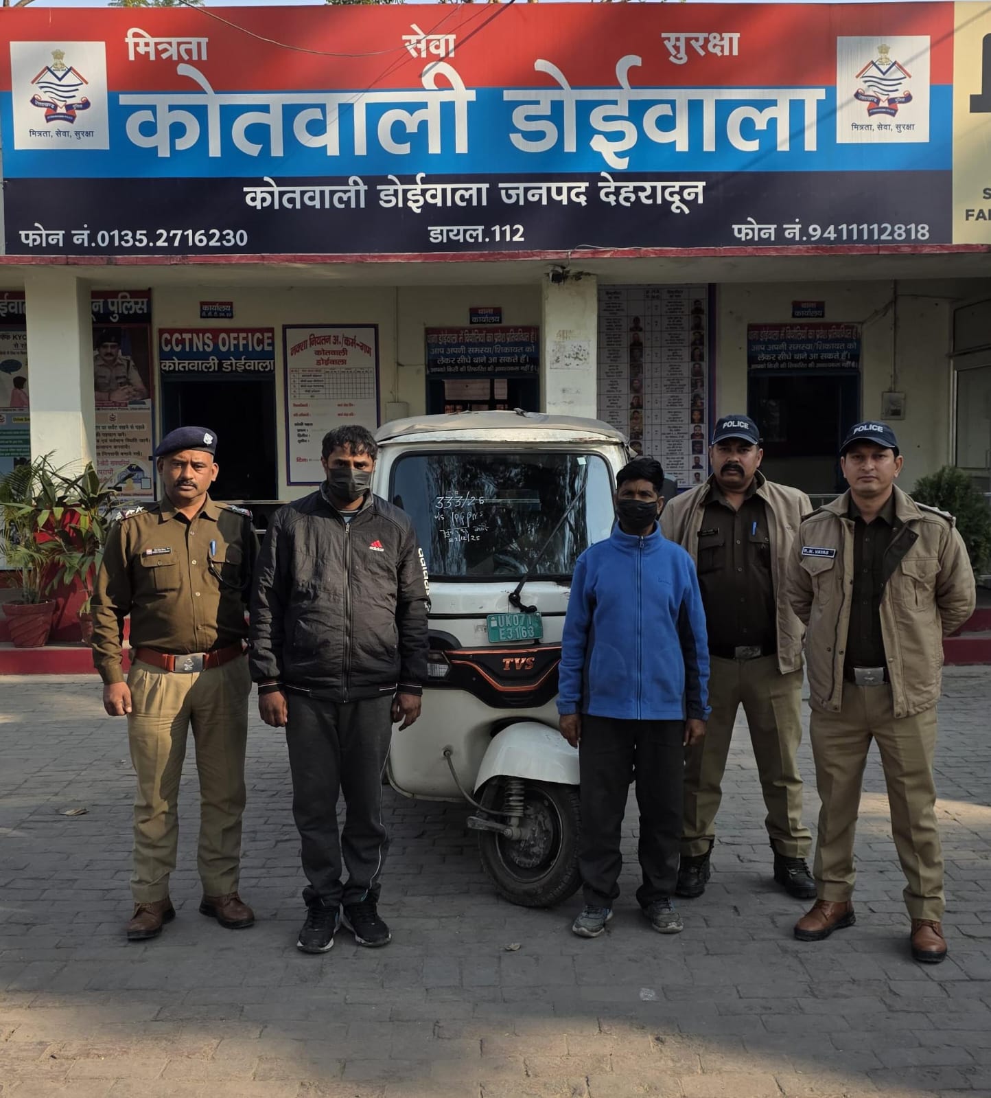 पुलिस टीम द्वारा त्वरित प्रयास करते हुए दिनांक 26-12-2025 को थानो रोड, कोठारी मौहल्ला के पास जौलीग्रान्ट, डोईवाला से दोनो अभियुक्तों *01: भुवनेश चन्द्र उर्फ जॉनी तथा 02: नाथीराम* को गिरफ्तार किया गया। घटना में प्रयुक्त ई-रिक्शा संख्या: यू0के0-07-टीई-3163 को सीज किया गया।