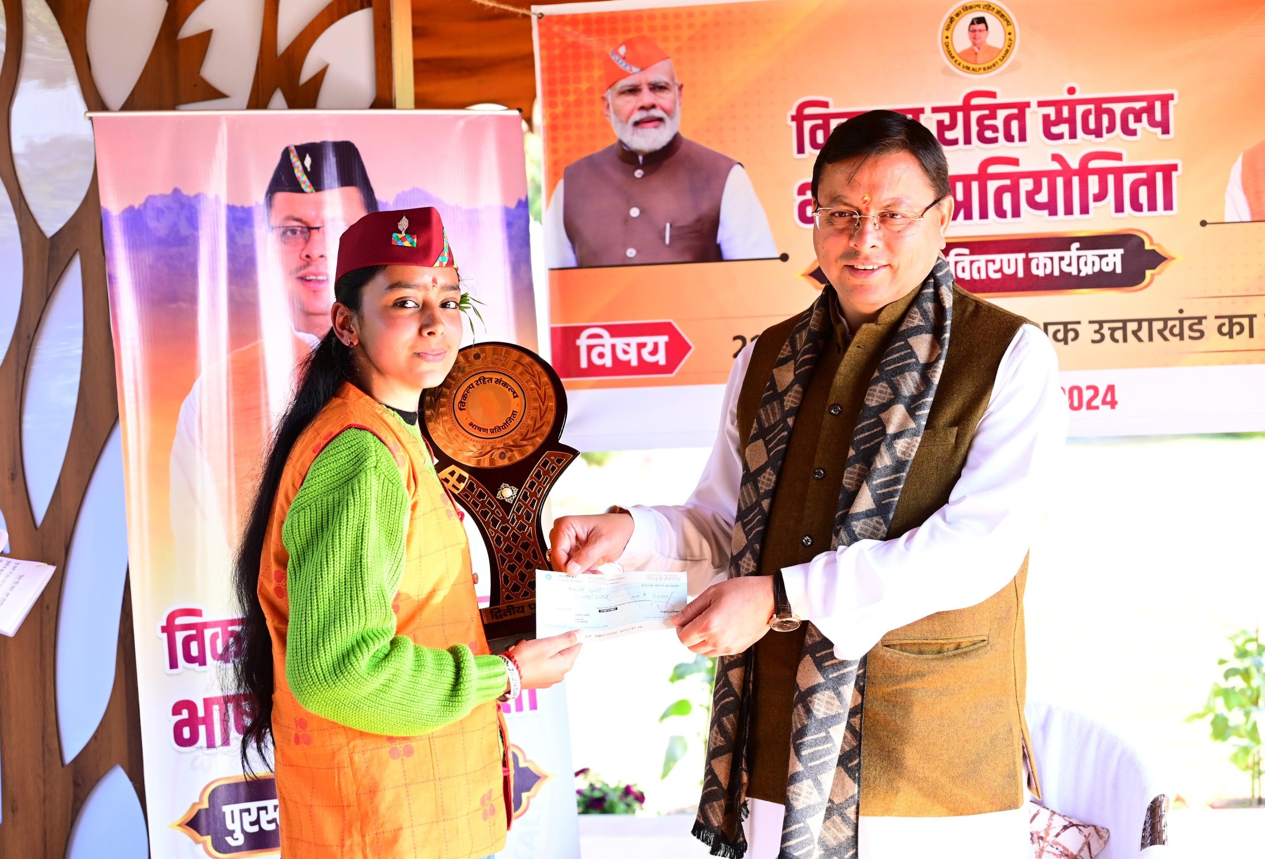 बुधवार को मुख्यमंत्री पुष्कर सिंह धामी ने मुख्यमंत्री आवास में आयोजित कार्यक्रम में प्रथम दुर्गेश अमोली, द्वितीय शाम्भवी मुरारी, तृतीय विनय कुमार, चतुर्थ आयुषी पांडे, तथा पंचम प्रज्ञा पंत को ट्रॉफी एवं पुरस्कार देकर सम्मानित किया।