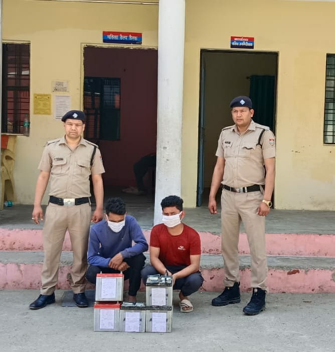 दिनांक 28/03/2024 को वादी नवनीत कंसल पुत्र रामसेवक कंसल निवासी गली नं0 A9 खैरी रोड नेपाली फार्म के पास, रायवाला द्वारा सूचना दी की उनकी 05 गाड़ियां (आईस्क्रीम वैन) उनके निर्माणाधीन मकान के पास में खडी थी, जिनमे से बैटरियां चोरी कर अपने वाहन में रखते हुए दो युवको को उनके द्वारा चोरी की 02 बैटरियों के साथ पकड लिया गया है।