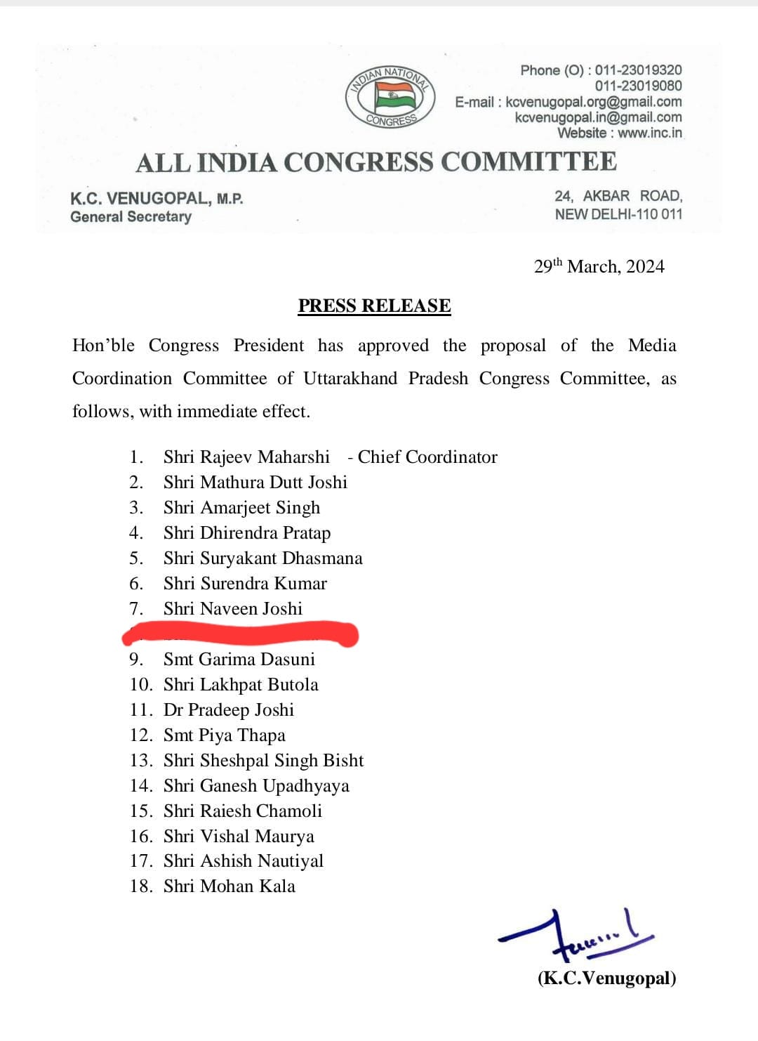 चुनाव को लेकर कांग्रेस ने उत्तराखंड में मीडिया कोऑर्डिनेटर की नियुक्ति कर दी है ।राजीव महर्षि को चीफ मिडिया कोऑर्डिनेटर बनाए गए हैं ।उनके साथ पार्टी के 18 नेताओं को भी मीडिया कोआर्डिनेशन के लिए रखा गया है। आपको बता दे राजीव महर्षि पार्टी के वरिष्ठ नेता है। और पिछले लंबे समय से मीडिया प्रभारी का काम देख रहे हैं। पिछले विधानसभा चुनाव में भी राजीव महर्षि ने मीडिया कोआर्डिनेशन का पदभार निभाया था,इस बार फिर केंद्रीय हाई कमान ने राजीव महर्षि पर भरोसा जताया है👇