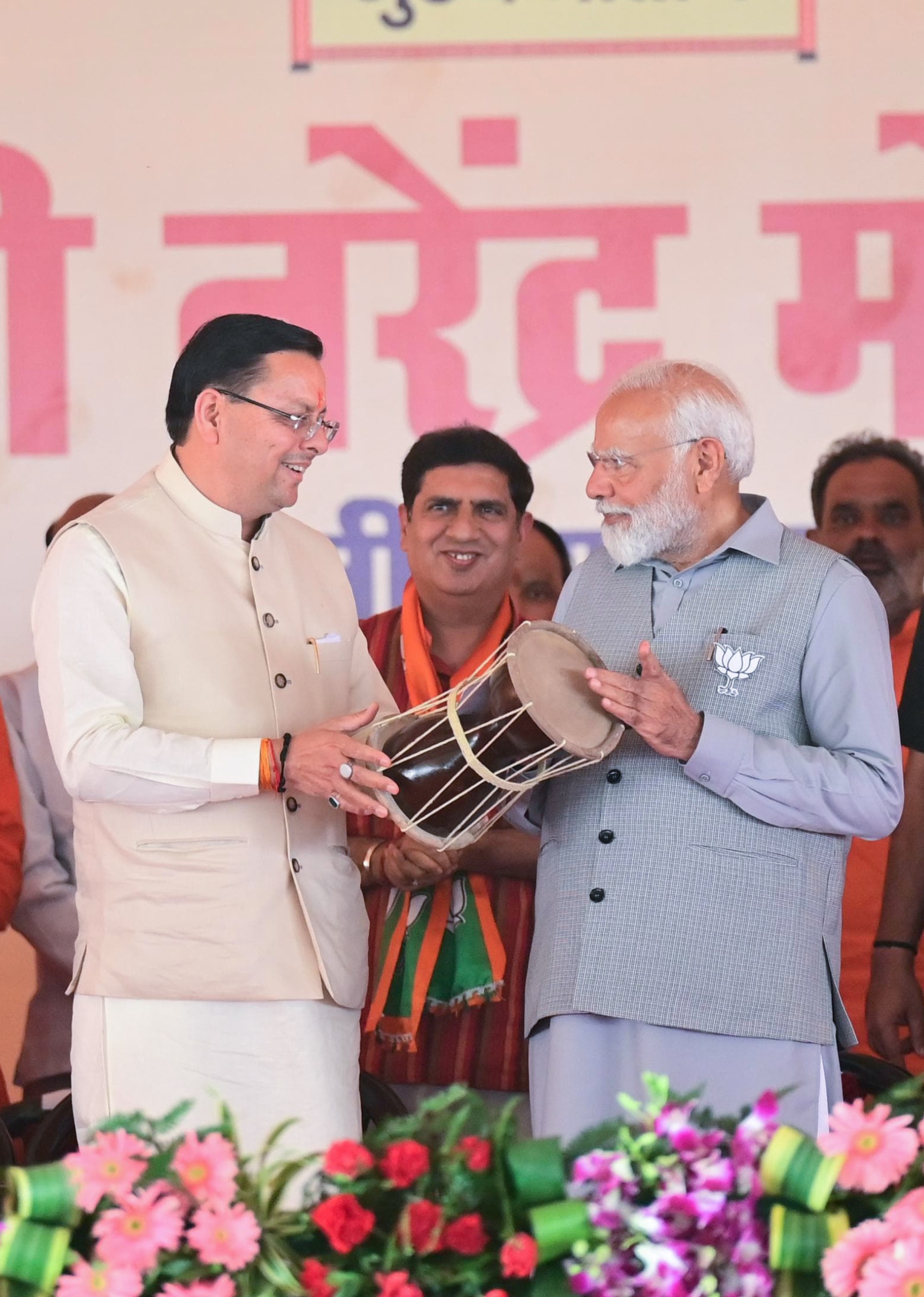 प्रधानमंत्री नरेंद्र मोदी ने गुरुवार को ऋषिकेश स्थित आई.डी.पी.एल मैदान में भाजपा उत्तराखंड द्वारा आयोजित विजय संकल्प रैली में प्रतिभाग किया। इस अवसर पर मुख्यमंत्री पुष्कर सिंह धामी ने *पहाड़ी वाद्य यंत्र हुड़का उपहार स्वरूप प्रधानमंत्री को भेंट कर उनका स्वागत किया। इस दौरान प्रधानमंत्री ने स्वयं भी हुड़का बजाया।*