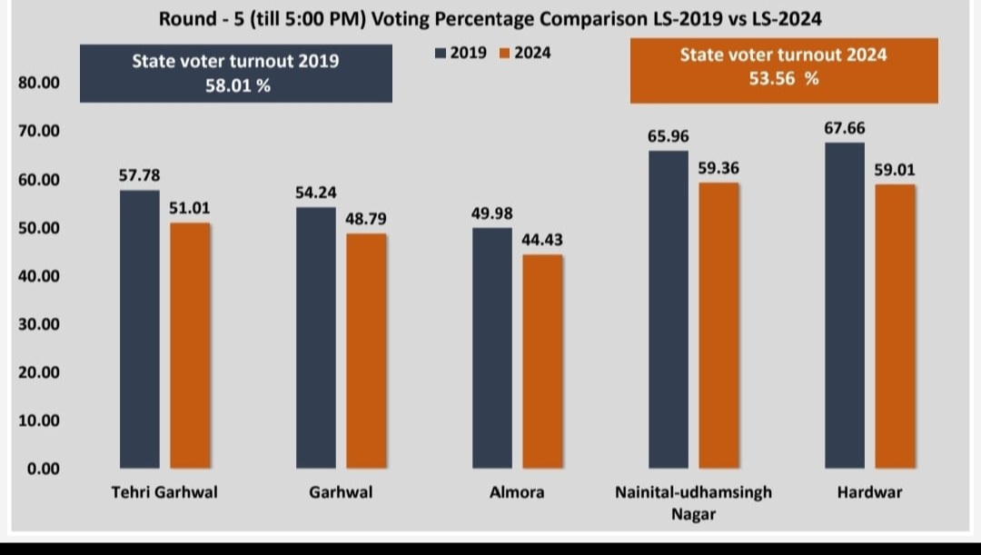 देवभूमि ऋषिकेश 19 अप्रैल 2024 / लोकसभा सामान्य निर्वाचन 2024 में लोगों ने अपनी उदासीनता दिखाई 2019 के मुकाबले वोट प्रतिशत का आकलन लगभग 5% कम रहा, पूरे उत्तराखंड में पांचो सीटों पर वोट प्रतिशत के निम्न आंकड़े सामने आए हैं-