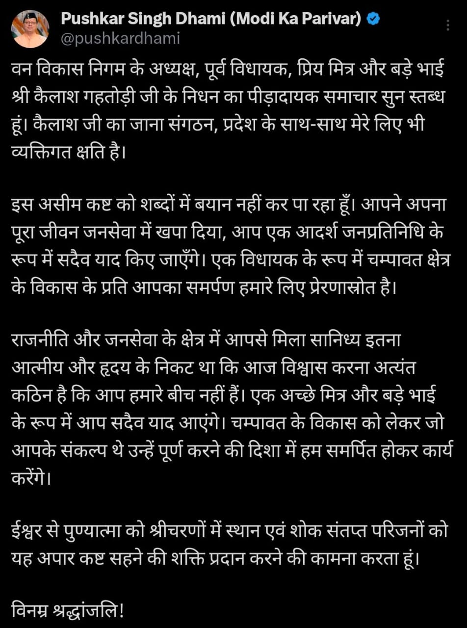 मुख्यमंत्री पुष्कर सिंह धामी ने पूर्व विधायक के निधन पर किया शोक व्यक्त
