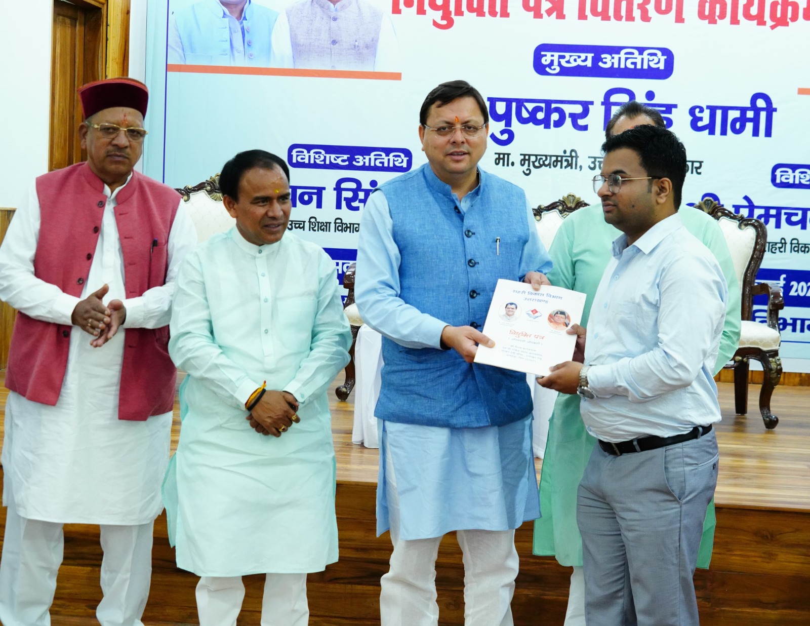 मुख्यमंत्री पुष्कर सिंह धामी ने सोमवार को मुख्यमंत्री आवास स्थित मुख्य सेवक सदन में आयोजित कार्यक्रम में उत्तराखण्ड लोक सेवा आयोग के माध्यम से उच्च शिक्षा विभाग में चयनित 68 असिस्टेंट प्रोफेसर, शहरी विकास विभाग में चयनित 63 अधिशासी अधिकारी एवं 22 कर व राजस्व निरीक्षकों को नियुक्ति पत्र प्रदान किए।