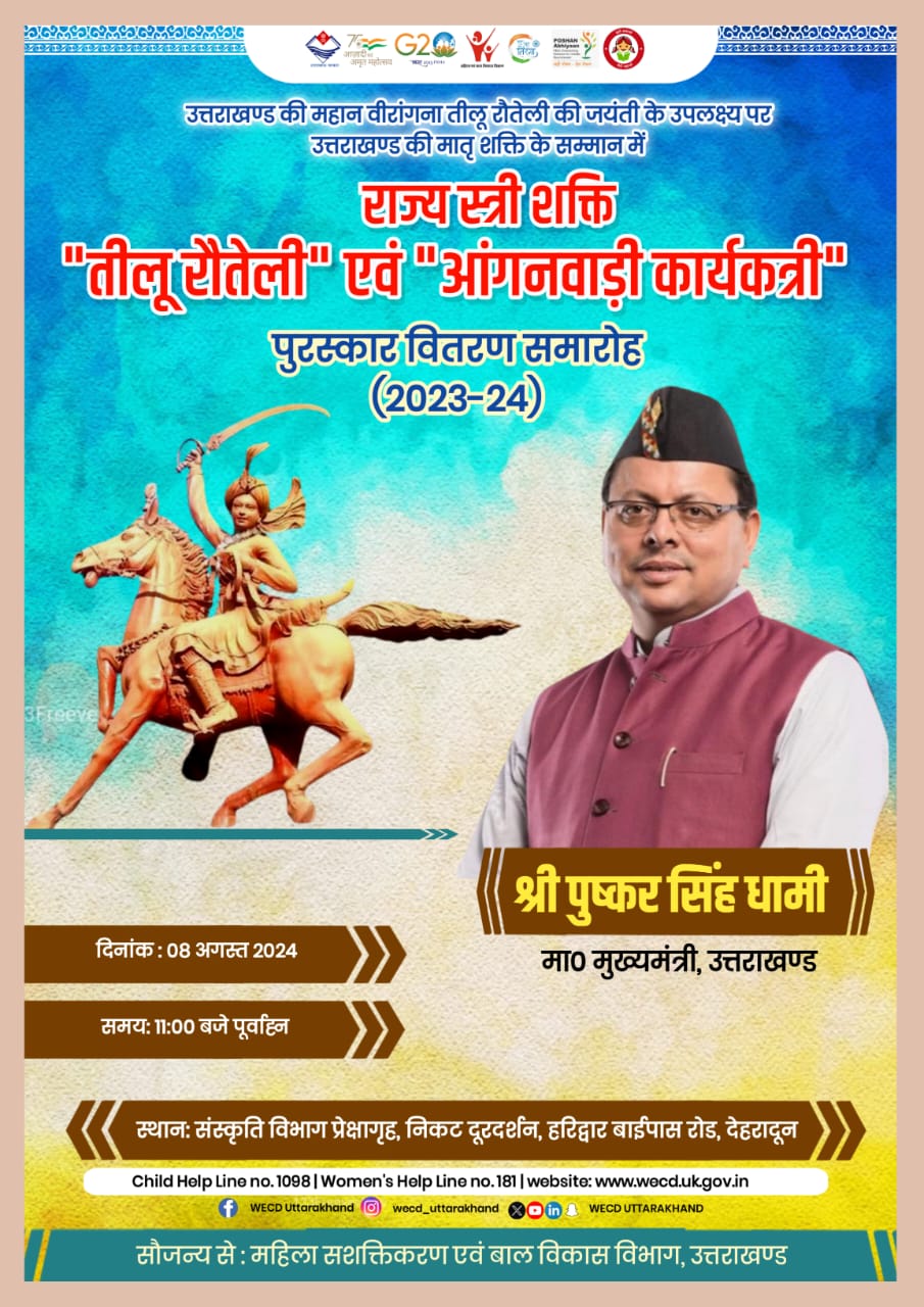 कल राजधानी देहरादून में विभिन्न क्षेत्र में उत्कृष्ट कार्य करने वाली महिला को सम्मानित किया जाएगा।यह बात मीडिया से बात करते हुए महिला एवं बाल विकास मंत्री रेखा आर्या ने कही कि हर साल राज्य में 8 अगस्त को मनाया जाने वाले तीलू और आंगनबाड़ी पुरस्कार को लेकर वृद्ध स्तर पर कार्य योजना तैयार की जाती है। जिसके दृष्टिगत कल देहरादून के हरिद्वार बाईपास पर स्थित संस्कृति विभाग प्रेक्षाग्रह में सभी महिलाओ को सम्मान दिया जाएगा।
