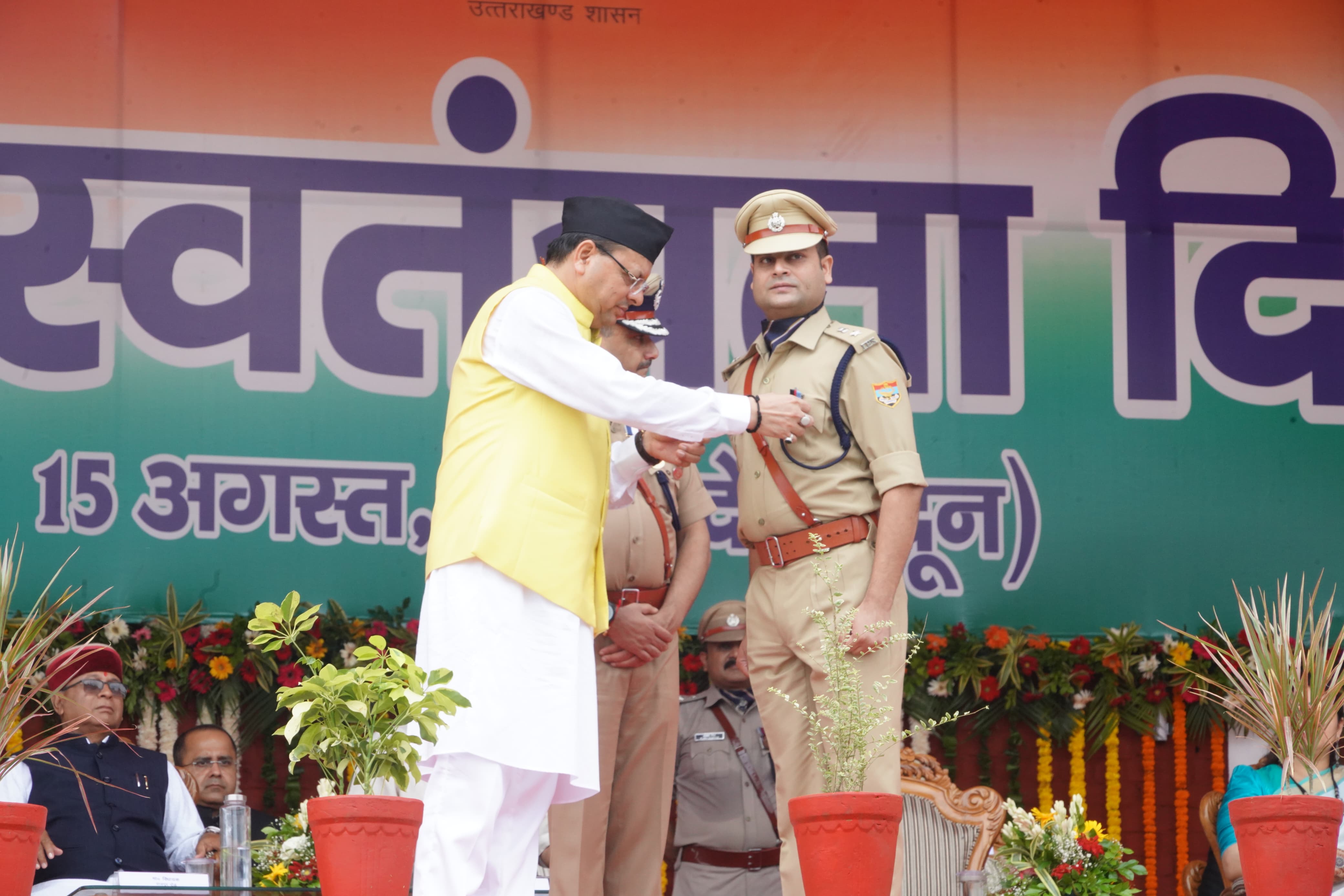 मुख्यमंत्री ने इस अवसर पर मुख्यमंत्री सराहनीय सेवा पदक से अपर पुलिस अधीक्षक, एस०डी०आर०एफ० विजेन्द्र दत्त डोभाल एवं दलनायक आईआरबी द्वितीय प्रताप सिंह तोमर को सम्मानित किया। सेनानायक, एस०डी०आर०एफ० उत्तराखण्ड मणिकान्त मिश्रा और पुलिस अधीक्षक, जनपद उत्तरकाशी अर्पण यदुवंशी को मुख्यमंत्री ने विशिष्टि कार्य के लिए सराहनीय सेवा पदक से सम्मानित किया। वर्ष 2023 में पांचवी एशियन यूथ एथलेटिक्स, ताशकंद, उजबेकिस्तान में आयोजित अन्तरराष्ट्रीय एथलेटिक्स चैंपियनशिप में स्वर्ण पदक अर्जित करने वाले प्रियांशु, रजत पदक प्राप्त करने वाले राहुल सरनालिया एवं एथलेटिक्स प्रशिक्षक लोकेश कुमार को भी मुख्यमंत्री द्वारा सम्मानित किया गया।
