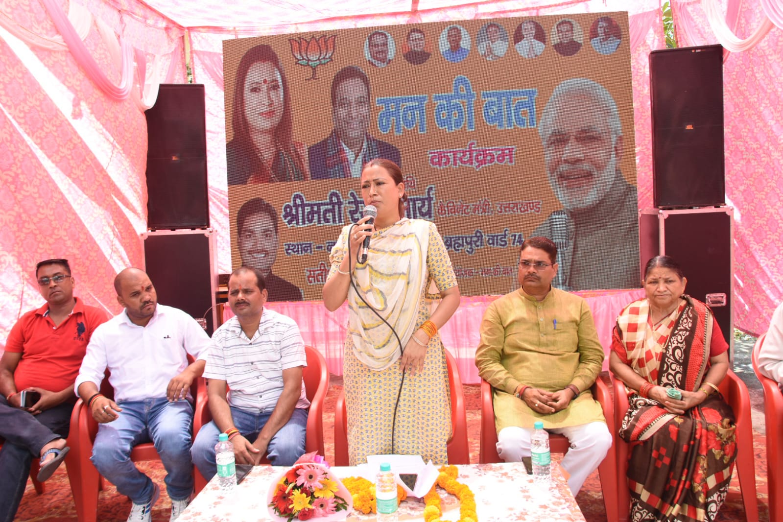 प्रदेश की कैबिनेट मंत्री रेखा आर्या ने रविवार को देहरादून के धर्मपुर में, वार्ड संख्या- 74 (ब्रह्मपुरी) की बूथ संख्या- 48 पर, प्रधानमंत्री नरेन्द्र मोदी के मासिक जनसंवाद कार्यक्रम ‘मन की बात’ का क्षेत्र की सम्मानित जनता के साथ श्रवण किया। इस दौरान मंत्री रेखा आर्या ने वहां उपस्थित लोगों से, प्रधानमंत्री नरेन्द्र मोदी के विचारों को आत्मसात करने और साझा प्रयासों से सामाजिक उत्थान को सुनिश्चित करने की दिशा में आगे बढ़ने की अपील की। मंत्री रेखा आर्या ने कहा कि ‘मन की बात’ सामाजिक सरोकारों और राष्ट्र निर्माण में जन भागीदारी को रेखांकित करने वाला कार्यक्रम है और इसमें शामिल किए जाने वाले सामान्य जन मानस के प्रयास हम सभी को प्रेरणा देने वाले होते हैं। कार्यक्रम स्थल पर एक पेड़ मां के नाम कार्यक्रम के अंतर्गत वृक्षारोपण भी किया गयाI