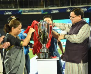 देहरादून।आज खेल मंत्री रेखा आर्या रायपुर स्थित राजीव गांधी क्रिकेट इंटरनेशनल स्टेडियम में उत्तराखंड प्रीमीयर लीग में सम्मिलित हुई। इस दौरान खेल मंत्री रेखा आर्या और मुख्यमंत्री पुष्कर सिंह धामी ने उत्तराखंड प्रीमीयर लीग की ट्रॉफी का अनावरण किया। खेल मंत्री रेखा आर्या ने कहा प्रदेश के खिलाड़ियों के लिए क्रिकेट एसोसिएशन ऑफ़ उत्तराखंड के द्वारा खिलाड़ियों को आईपीएल की तर्ज पर मंच दिया जाना बेहद सराहनीय पहल है, निश्चित ही उत्तराखंड प्रीमीयर लीग से प्रदेश के उभरते हुए खिलाड़ियों को अपनी प्रतिभा दिखाने के लिए नया मंच मिलेगा और इस प्रकार की प्रतियोगिताओं से महिला सशक्तिकरण को भी नया आयाम मिलता है ।