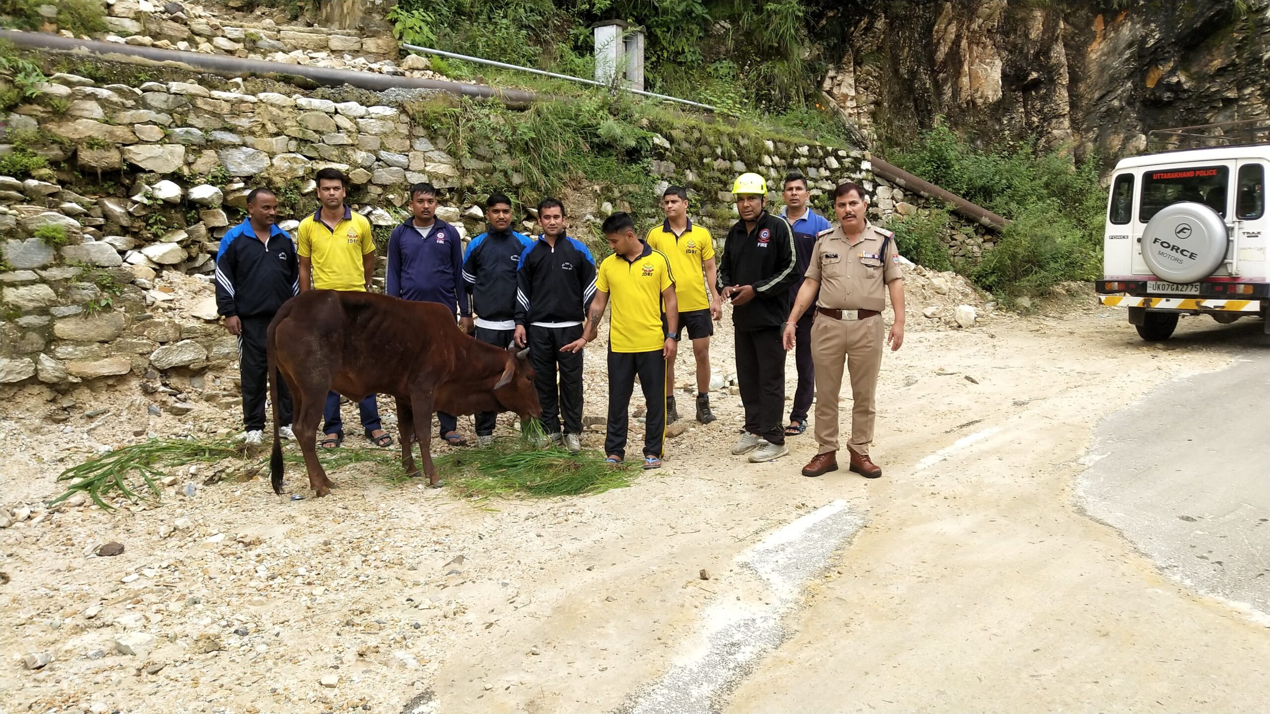 SDRF टीम द्वारा मौके पर पहुँचकर त्वरित कार्यवाही करते हुए FIRE सर्विस तथा जिला पुलिस के संयुक्त प्रयास से उफनती नदी से गाय को सकुशल नदी के बीच से निकालकर सड़क मार्ग तक लाकर सुरक्षित स्थान पर पहुंचाया गया।