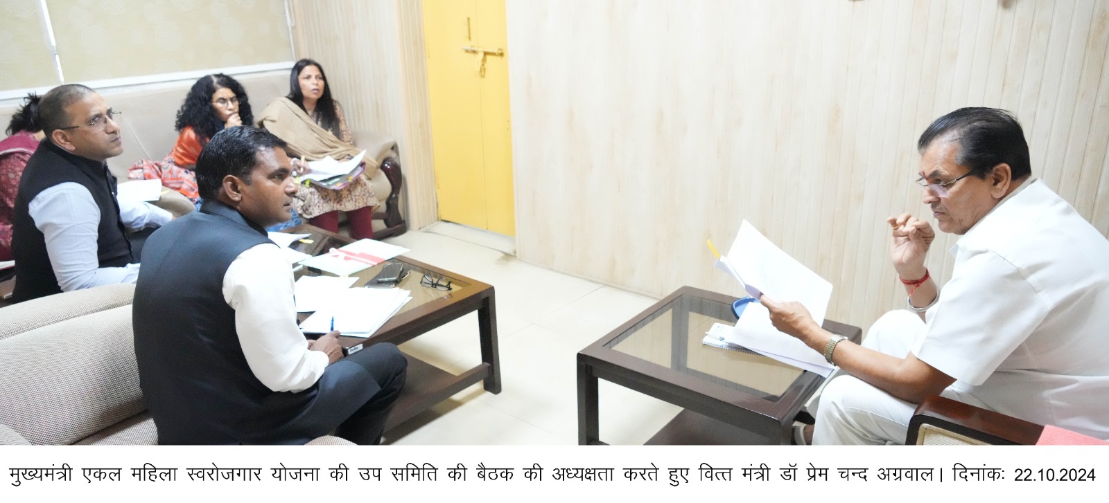 प्रदेश के वित्त मंत्री डॉ. प्रेम चन्द अग्रवाल की अध्यक्षता में गठित मुख्यमंत्री एकल महिला स्वरोजगार योजना की उप समिति की बैठक विधानसभा स्थित सभागार कक्ष में सम्पन्न हुई। प्रदेश की एकल महिलाओं को आत्मनिर्भर बनाने के उद्देश्य से प्रदेश सरकार मुख्यमंत्री एकल महिला स्वरोजगार योजना शीघ्र ही लॉन्च करने जा रही है। जिसको लेकर वित्त मंत्री ने सम्बन्धित अधिकारियों के साथ विस्तृत चर्चा की।