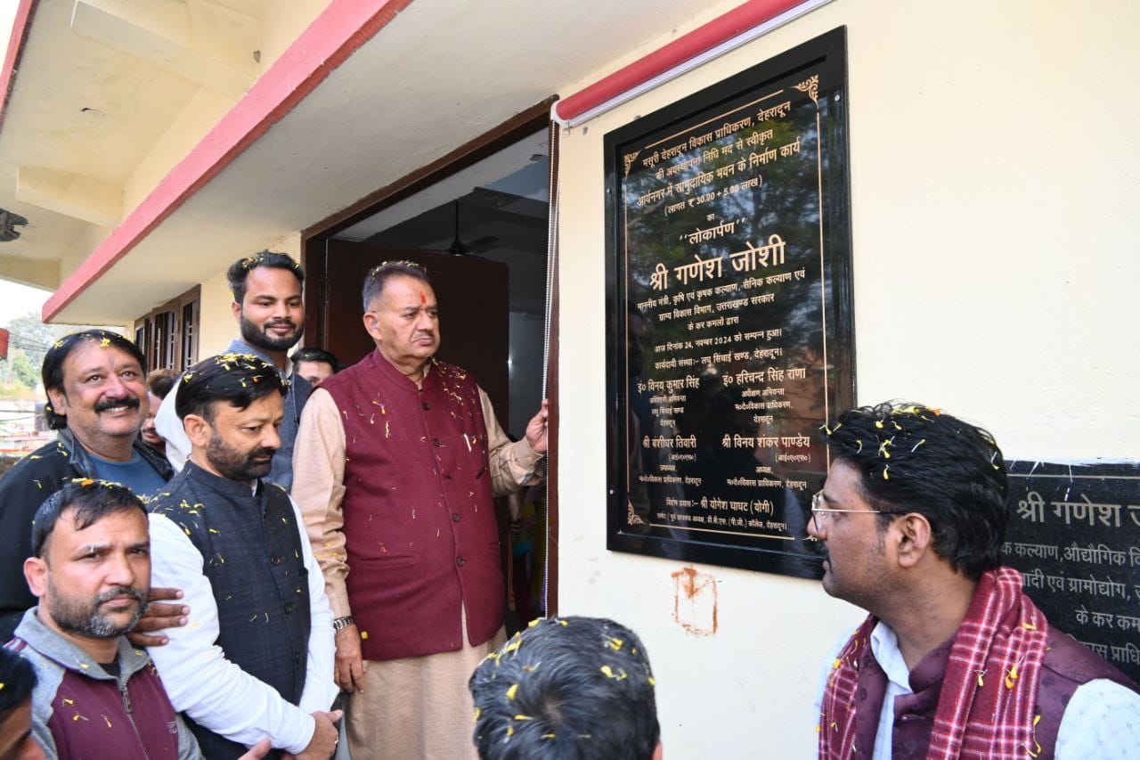 देहरादून, 24 नवम्बर। कैबिनेट मंत्री गणेश जोशी ने रविवार को देहरादून के मसूरी विधानसभा क्षेत्र के अंतर्गत आर्यनगर में मसूरी देहरादून विकास प्राधिकरण देहरादून की अवस्थापना निधि मद से स्वीकृत ₹35 लाख की लागत से नव निर्मित सामुदायिक भवन लोकार्पण किया।