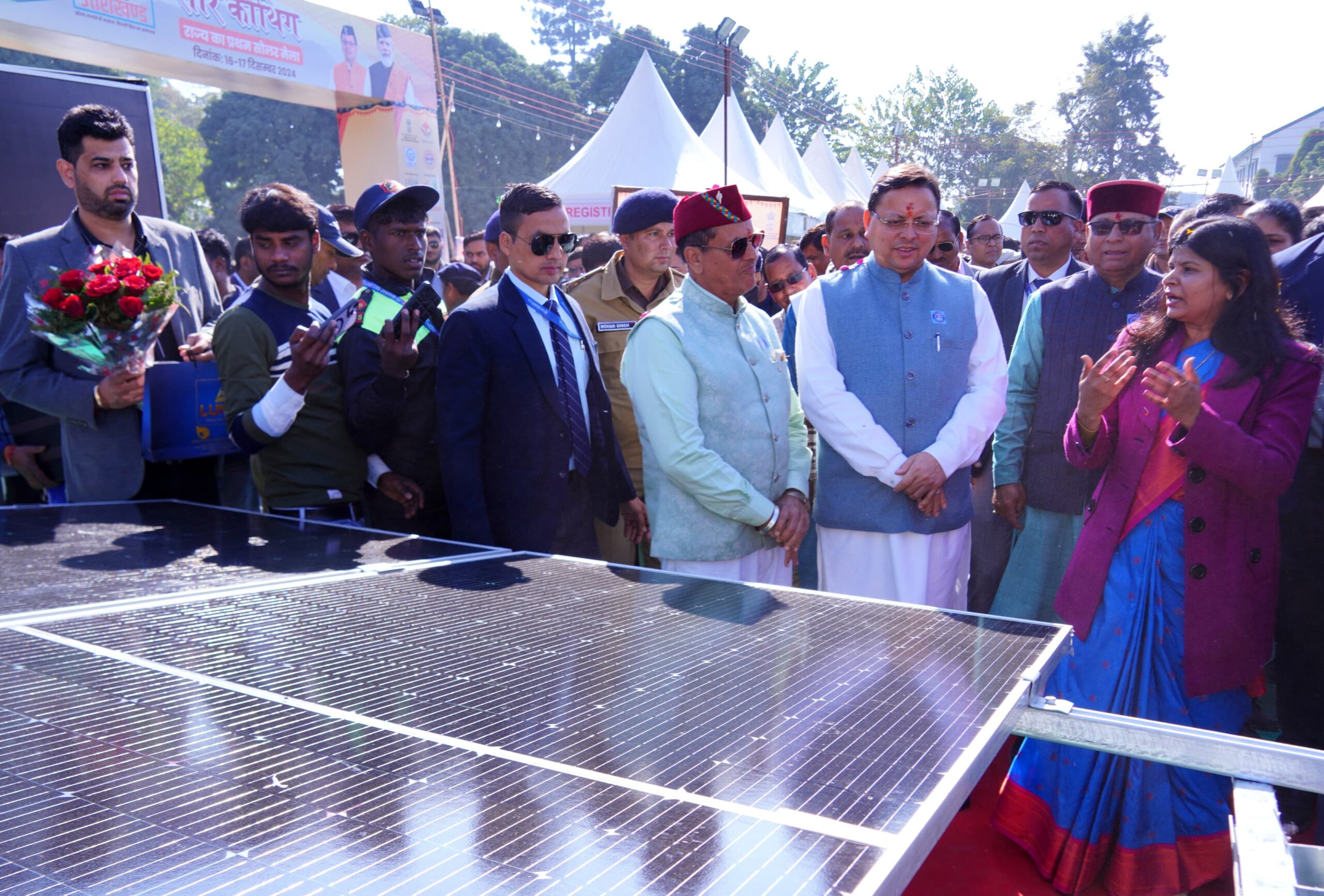 मुख्यमंत्री पुष्कर सिंह धामी ने सोमवार को रेंजर्स ग्राउण्ड देहरादून में ‘ उत्तराखण्ड के प्रथम सोलर मेले दो दिवसीय ‘सौर कौथिग’ का शुभारंभ किया। इस अवसर पर उन्होंने पीएम सूर्यघर योजना, मुख्यमंत्री सौर स्वरोजगार योजना और सोलर वाटर हीटर योजना के लाभार्थियों को अनुदान राशि के चेक प्रदान करने के साथ ही यूपीसीएल मुख्यालय में बनाई गई सौर ऊर्जा आधारित म्यूरल आर्ट का लोकार्पण भी मुख्यमंत्री ने किया। मुख्यमंत्री ने सौर ऊर्जा जन जागरूकता के लिए चलाई जा रही सोलर वैन को भी हरी झण्डी दिखाकर रवाना किया। इसके माध्यम में आगामी सौ दिनों तक सोलर ऊर्जा से संबंधित विभिन्न जानकारी लोगों को दी जायेगी। साथ ही विभिन्न स्टॉल पर जाकर सौर ऊर्जा के क्षेत्र में किए जा रहे नवोन्मेषी प्रयोगों की जानकारी ली।