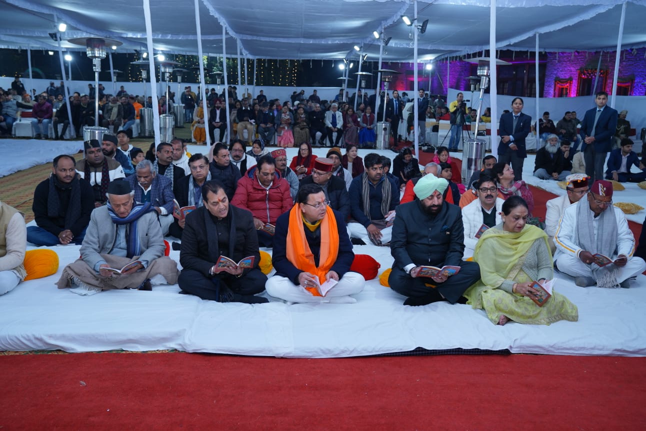 मुख्यमंत्री आवास में शुक्रवार को सांय प्रभु श्रीराम मन्दिर प्राण प्रतिष्ठा के शुभ अवसर पर राज्यपाल ले.ज. गुरमीत सिंह एवं मुख्यमंत्री पुष्कर सिंह धामी की उपस्थिति में सुन्दरकांड के पाठ के आयोजन के साथ भव्य श्रीराम संध्या आयोजित हुई। भजन गायिका स्वाति मिश्रा एवं विवेक नौटियाल की टीम द्वारा प्रस्तुत किये गये सुन्दरकांड के सस्वर पाठ के भजनों से पूरा वातावरण राममय तथा सभी लोग श्रीराम की भक्ति में भव विभोर नजर आये। सुन्दरकांड के सस्वर सुन्दर पाठ से वातावरण और अधिक भक्तिपूर्ण बन गया था।