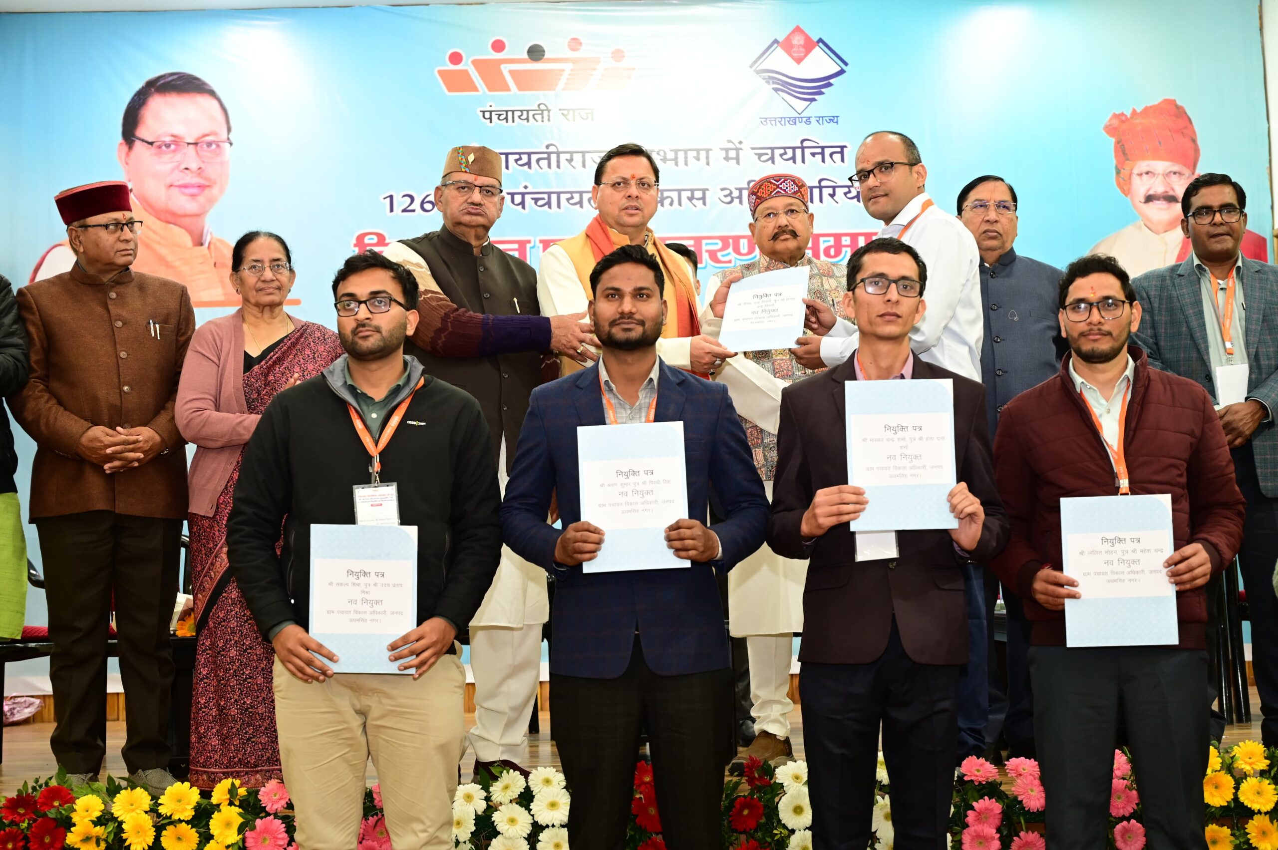 मुख्यमंत्री पुष्कर सिंह धामी ने गुरूवार को मुख्यमंत्री आवास स्थित मुख्य सेवक सदन में पंचायतीराज विभाग के अन्तर्गत 126 नवनियुक्त ग्राम पंचायत विकास अधिकारियों को नियुक्ति पत्र प्रदान किये। पिछले साढ़े तीन सालों में राज्य में 20 हजार से अधिक युवाओं को सरकारी सेवाओं में नौकरी प्रदान की गई है। मुख्यमंत्री ने सभी अभ्यर्थियों को शुभकामनाएं देते हुए कहा कि यह दिन आपके जीवन में एक नया अध्याय लेकर आया है। उन्होंने आशा व्यक्त करते हुए कहा नव चयनित अभ्यर्थी लोकतंत्र की सबसे महत्वपूर्ण इकाई ग्राम पंचायत के अभिन्न अंग बनकर गाँवों का समग्र विकास सुनिश्चित करने की दिशा में कार्य करेंगे। राज्य के समग्र विकास के लिए गांवों का विकास जरूरी है। गांवों के विकास में एक ग्राम पंचायत विकास अधिकारी की भूमिका अत्यंत महत्वपूर्ण होती है।