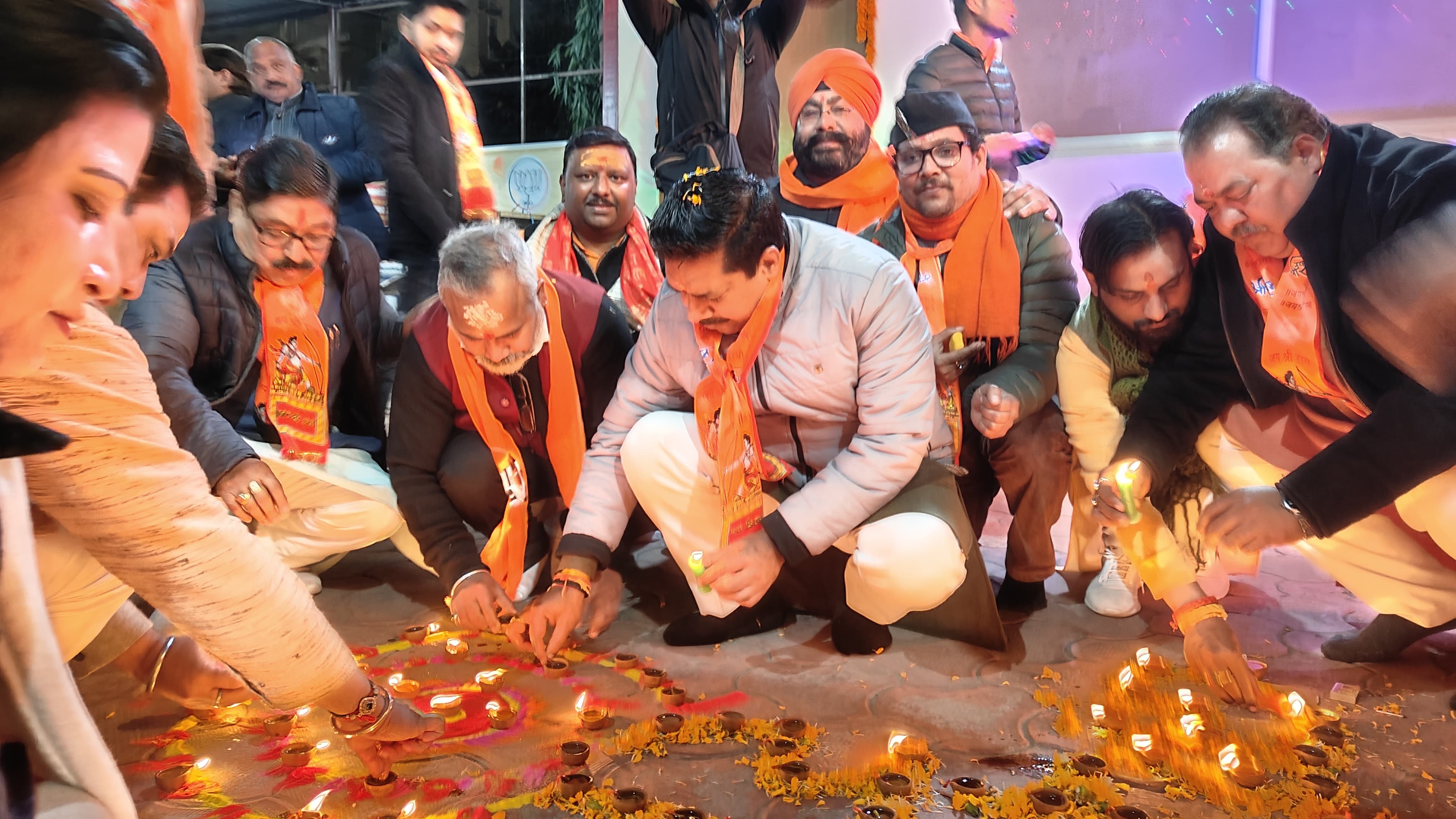 अयोध्या में श्री रामलला के प्राण प्रतिष्ठा पर उत्तराखंड में हर तरफ श्रीरामोत्सव मनाया गया। उत्तराखंड बीजेपी प्रदेश मुख्यालय में प्रदेश महामंत्री संगठन अजेय कुमार की मौजूदगी में हनुमान चालीसा पाठ के साथ भजन संध्या एवं दीपोत्सव का आयोजन किया। इस श्रीरामोत्सव कार्यक्रम में प्रस्तुत श्रीराम भजन में सभी लोग भक्ति रस से सरोबार होकर झूमते रहे। शाम को दीपक जलाकर दीपावली मनाई गई और जमकर आतिशबाजी की गई। साथ ही धार्मिक गानों पर कार्यकर्ताओं ने जमकर नृत्य कर श्रीरामोत्सव की खुशी मनाई ।बीजेपी के प्रदेश कर्यालय सचिव कौस्तुभानंद जोशी ने कहा कि श्रीराम आगमन के इस युग युगांतकारी क्षणों की अनुभूति के लिए प्रदेश मुख्यालय में हनुमान चालीसा के 11 पाठ और भजन संध्या का आयोजन किया। साथ ही 5 शताब्दियों के बाद प्रभु के अपने धाम पधारने की खुशी में दीपक से कार्यलय परिसर मैं दीपक जलाकर दीपावली मनाई गई।