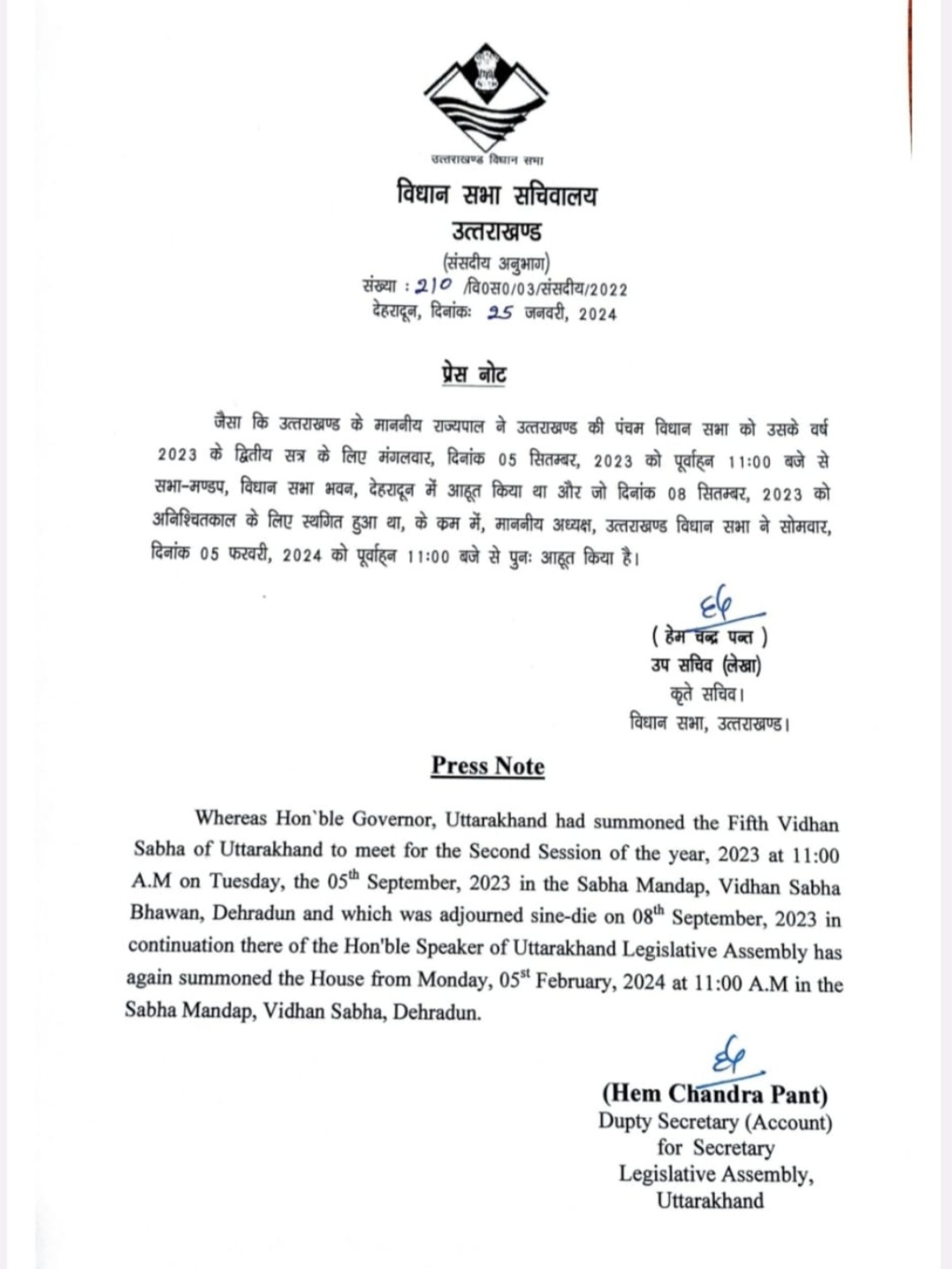 5 फरवरी को शुरू होगा उत्तराखंड विधानसभा का सत्र