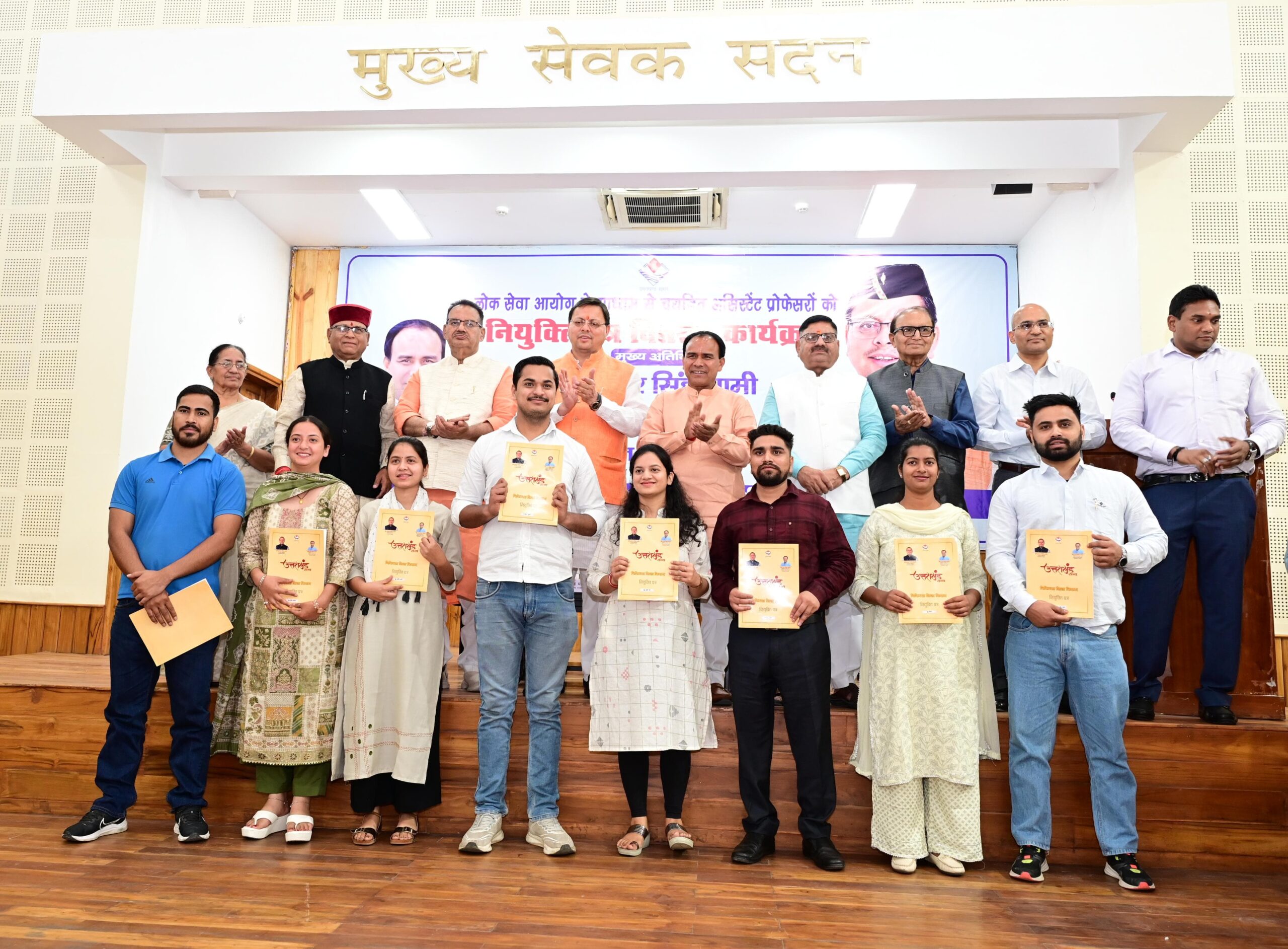 मुख्य सेवक सदन में आयोजित कार्यक्रम में उच्च शिक्षा विभाग के अंतर्गत असिस्टेंट प्रोफेसर के 52 पदों पर लोक सेवा आयोग के माध्यम से चयनित अभ्यर्थियों के साथ ही चिकित्सा शिक्षा विभाग के अंतर्गत मेडिकल कॉलेजों के 18 प्रोफेसर्स व 36 एसोसिएट प्रोफसर्स और नर्सिंग कॉलेजों में ट्यूटर व मेडिकल सोशल वर्कर के 33 पदों पर चिकित्सा सेवा चयन आयोग के माध्यम से चयनित अभ्यर्थियों को नियुक्ति पत्र वितरित किए गए।