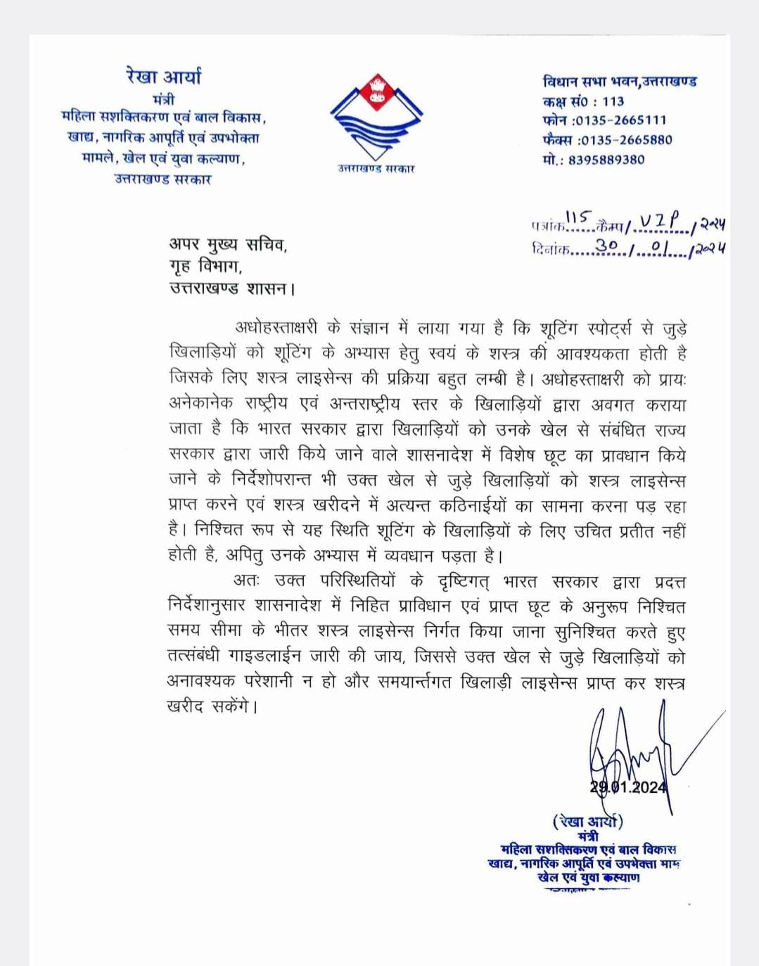 शूटिंग के खिलाड़ियो को जल्द ही एक बड़ी खुशखबरी मिलने वाली है।जिसके तहत शूटिंग खिलाड़ियो को शस्त्र लाइसेंस की सुविधा उपलब्ध होगी।खेल मंत्री रेखा आर्या ने उक्त विषय का संज्ञान लेते हुए सचिव गृह और पुलिस महानिदेशक को पत्र लिखा है।इस पत्र के माध्यम से उन्होंने कहा कि अभी तक जो भी शूटिंग से सम्बंधित खिलाड़ी होते है उन्हें अभ्यास के लिए शस्त्र लाइसेंस की अनुमति नही मिलती थी।